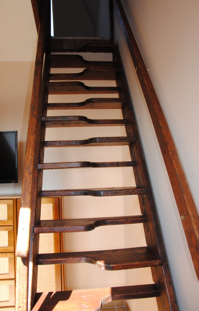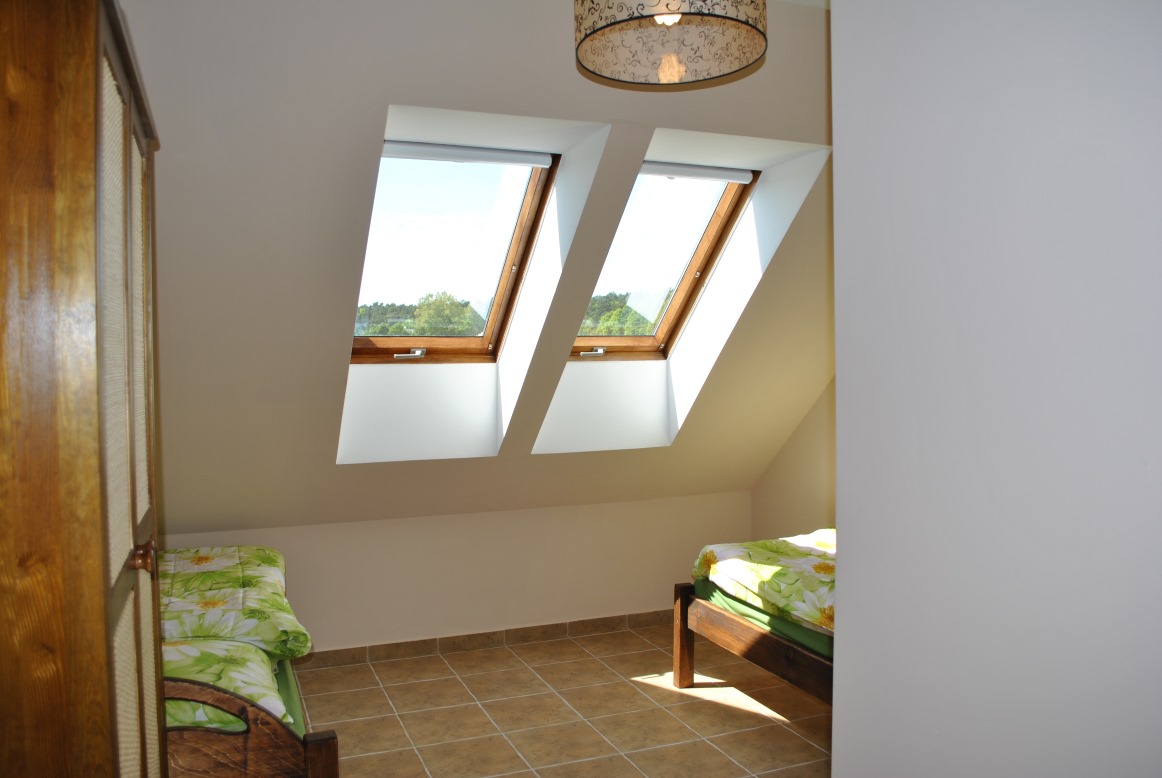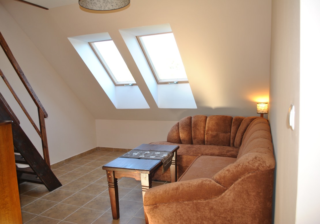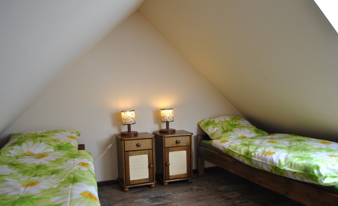 Oddajemy do Państwa dyspozycji apartament rodzinny na piętrze : na antresoli znajdują się dwa pojedyncze łóżka i szafki nocne, w pokoju dwa pojedyncze łózka, w części dziennej narożnik z funkcją spania. Pomiędzy pokojem a częścią dzienną nie ma drzwi. Dodatkowo w apartamencie jest szafa, komoda, ława, szafka nocna. W pokojach są parawany.