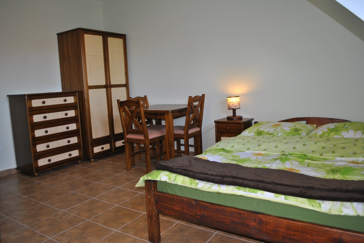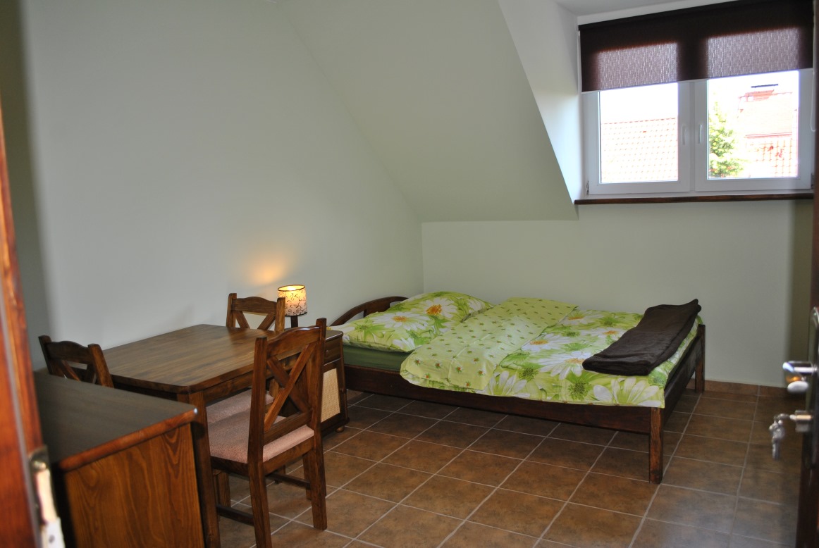 Pokój dwu-trzyosobowy na piętrze wyposażony jest w małżeńskie łóżko i rozkładaną sofkę, szafkę, komodę, szafkę nocną, stół trzy krzesła. W pokojach są parawany.
