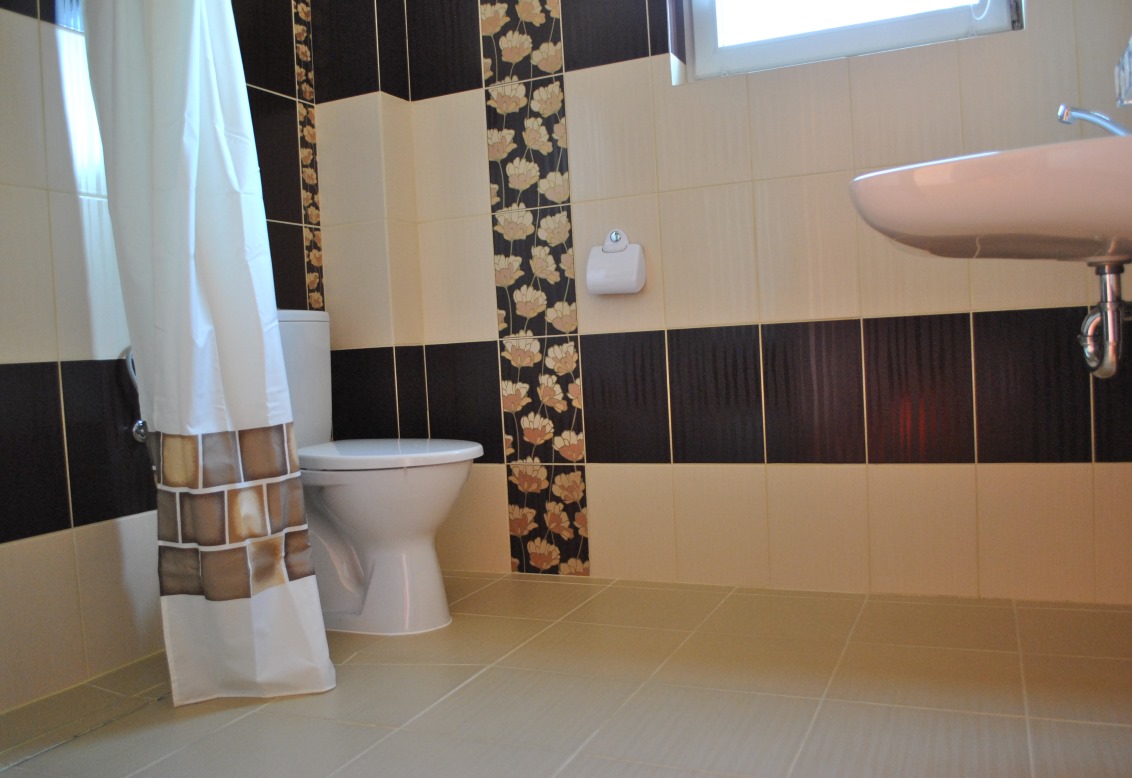 Pokoje na parterze posiadają bezpośrednie wyjście na wspólny taras na którym są stoły i ławki dla każdego pokoju.