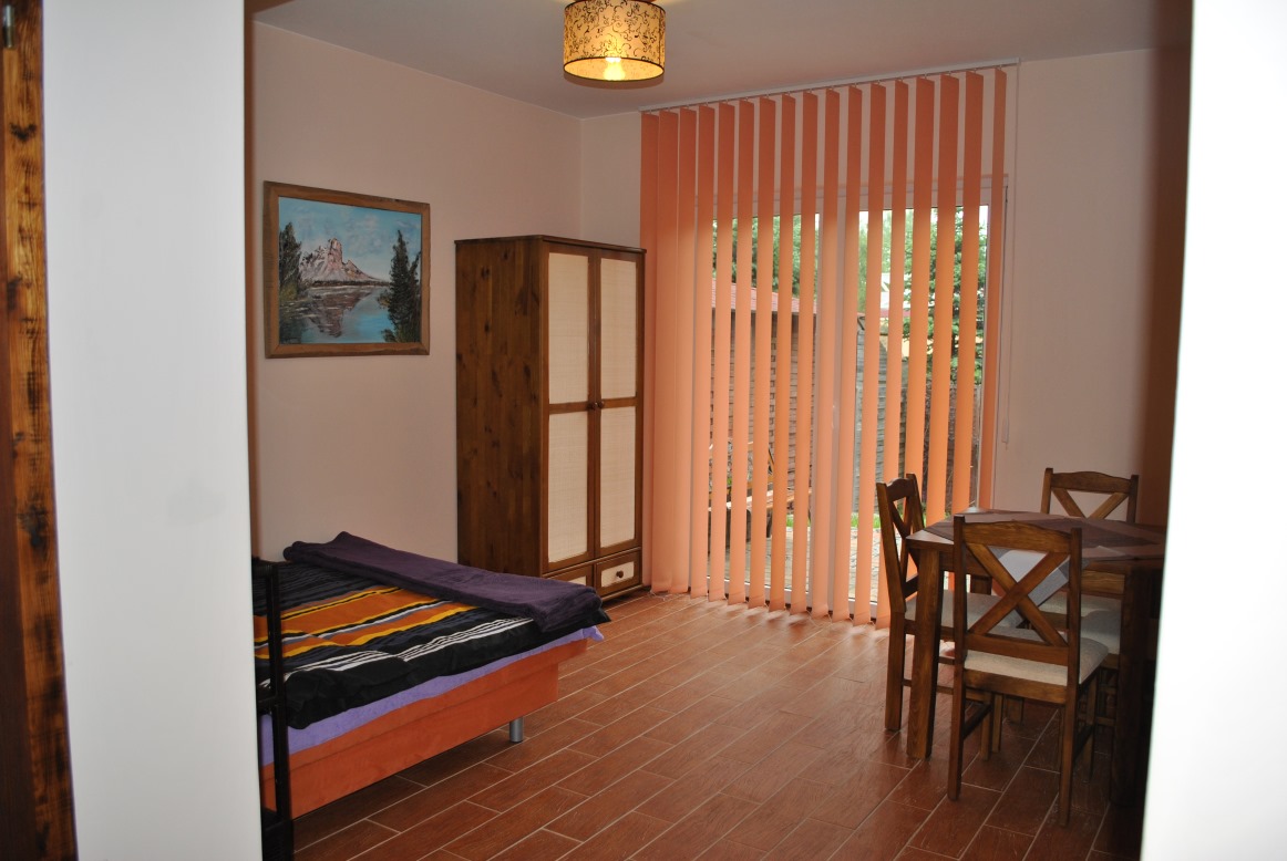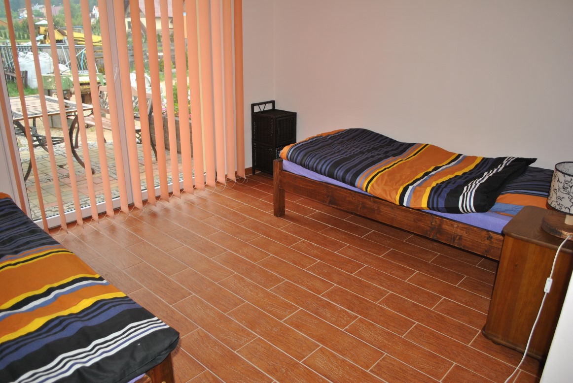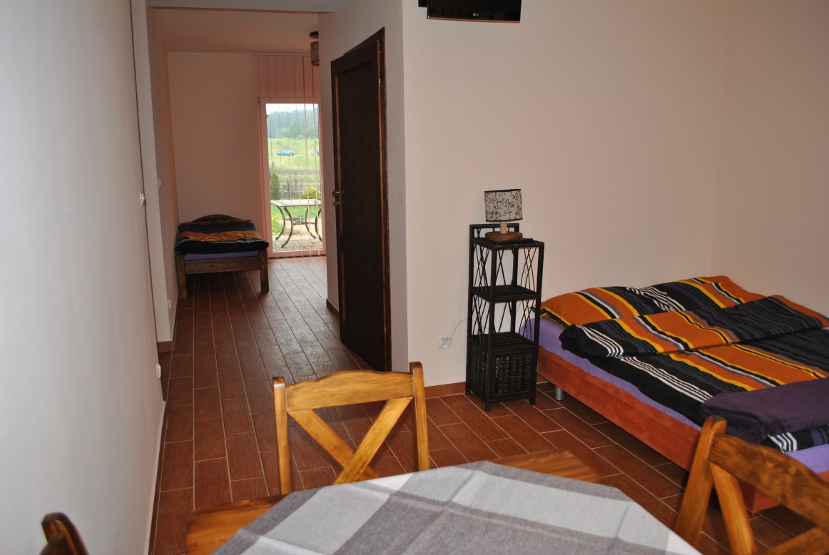 Pokój czteroosobowy na na parterze posiada małżeńskie łóżko i dwa łóżka pojedyncze, szafę, komodę, stół, cztery krzesła, szafkę nocną oraz telewizor. W pokojach są parawany.
