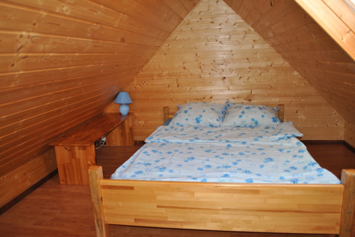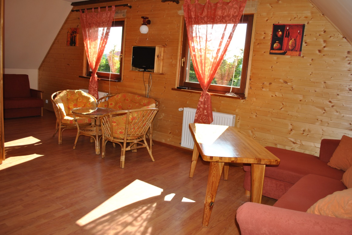 Na antresoli łoże małżeńskie, w pokoju narożnik z funkcja spania,rozkładana sofa, telewizor, szafa, szafka.